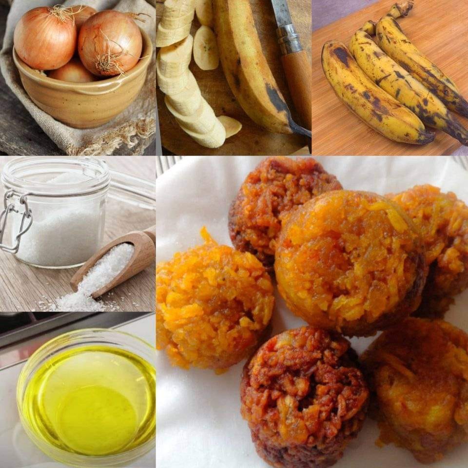 _ 3 a 4 dedos de banana-pão (bem maduras) _ 1 cebola _ sal (a gosto) _ 250 ml de óleo vegetal