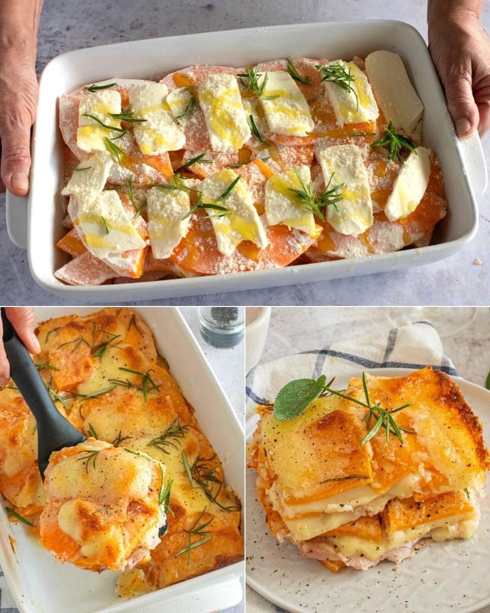 As fatias de abóbora serão dispostas num tabuleiro de forno e alternadas com deliciosas camadas de mozarela, presunto cozido e parmesão ralado; O resultado final será uma loucura.