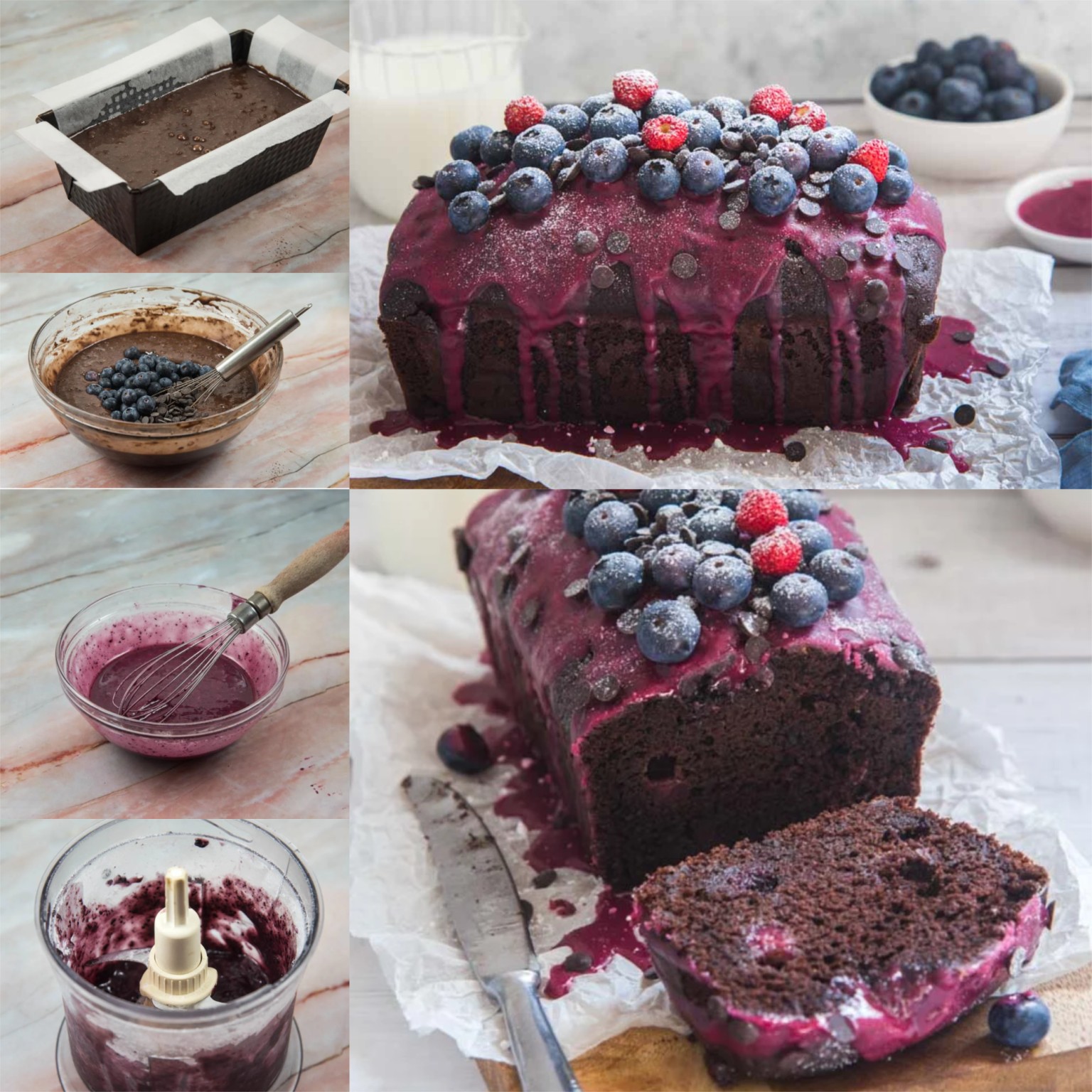 Bolo de ameixa de cacau e mirtilo