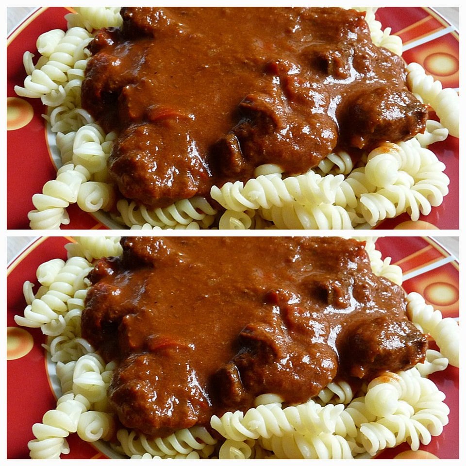 Descasque a cebola e corte-a em cubos grosseiros. Divida também a carne do goulash pelos pedaços desejados. Aqueça a banha numa panela grande e frite lentamente a cebola até ficar dourada. Retire o tacho do lume e bata a cebola finamente com uma batedeira.