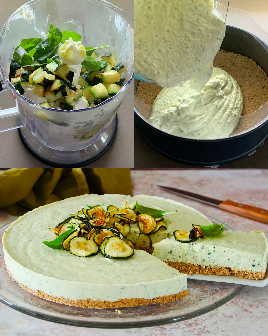 Para o preparar, triture os biscoitos no liquidificador, misture-os com a manteiga derretida e compacte-os no fundo de uma forma de fundo falso com 22 cm de diâmetro, forrada com papel vegetal. O recheio cremoso é feito cozinhando as curgetes cortadas em cubos numa panela com um fio de azeite e depois batendo-as no processador de alimentos com o queijo ricota escorrido, o parmesão ralado e uma mão cheia de manjericão. Quando o recheio estiver pronto, adicione as folhas de gelatina, humedecidas, bem espremidas e diluídas numa gota de leite quente. Deite a mistura sobre a base crocante e deixe firmar no frigorífico durante pelo menos 3 horas. O resultado será um cheesecake cheio de sabor que conquistará todos à primeira degustação.